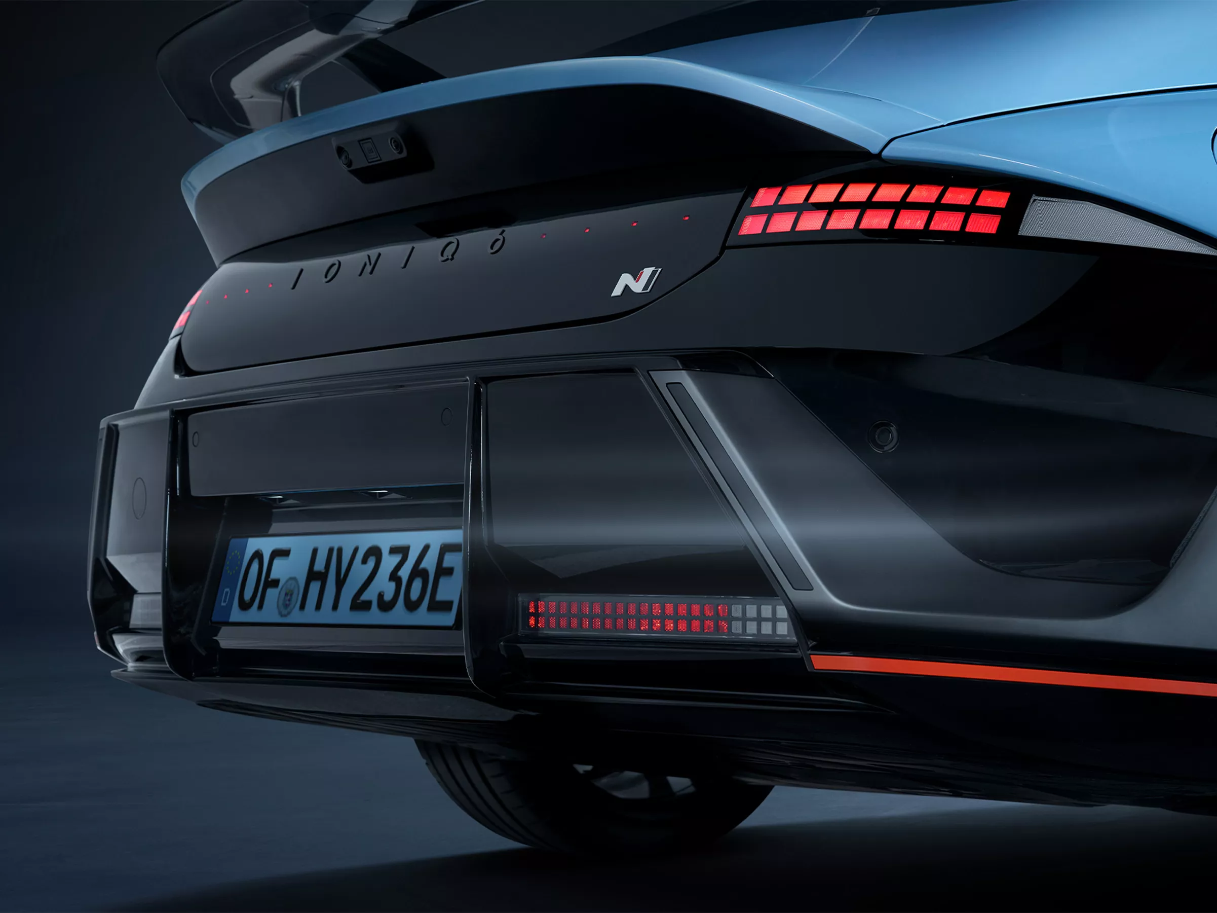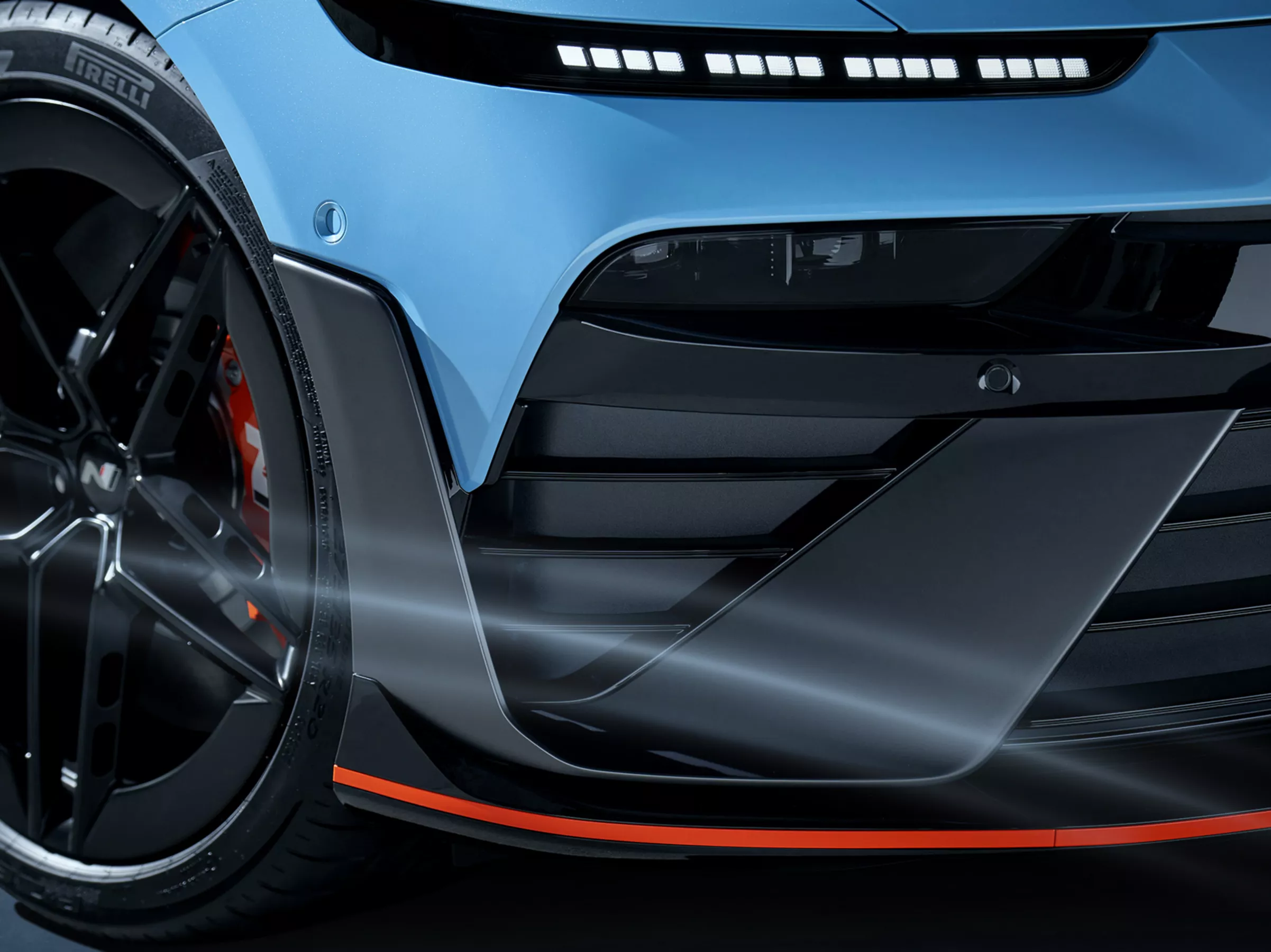 Inspired by the RN22e concept, the wing-type air curtains on both sides of the bumper emphasises N identity and enhance aerodynamic performance. N-specific bumpers and widened fenders emphasise its bold stance. The Luminous Orange accent line highlights the EV N design identity while visually widening and lowering the stance.