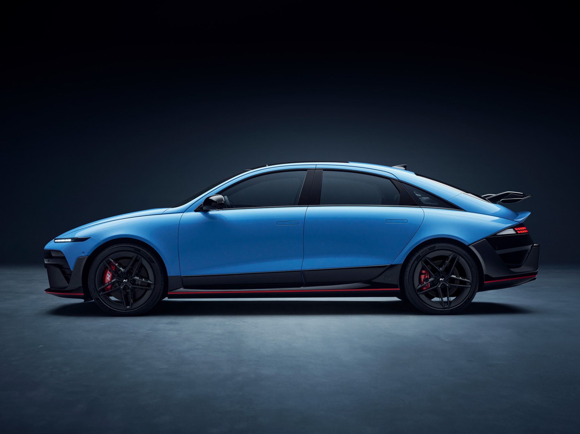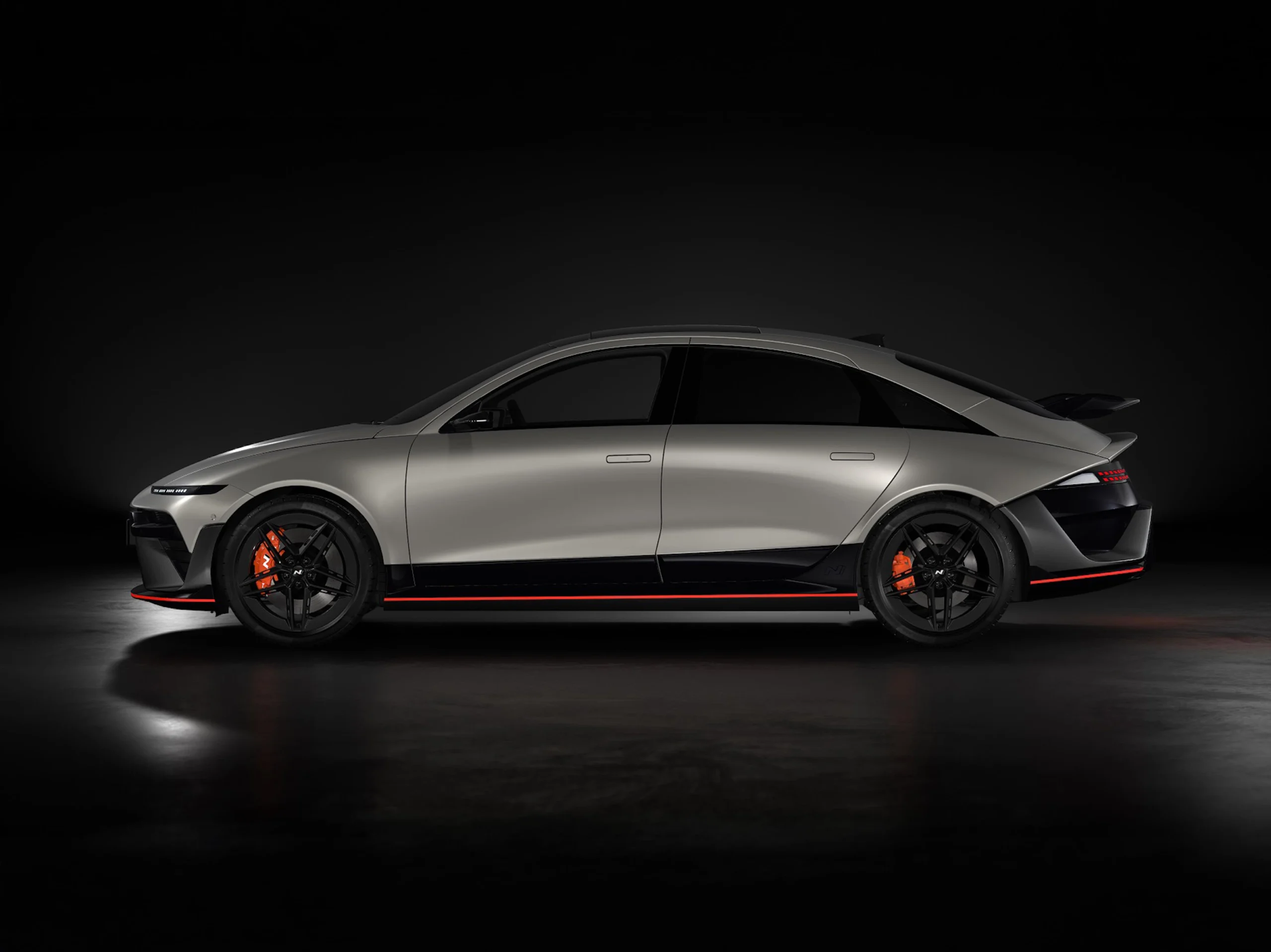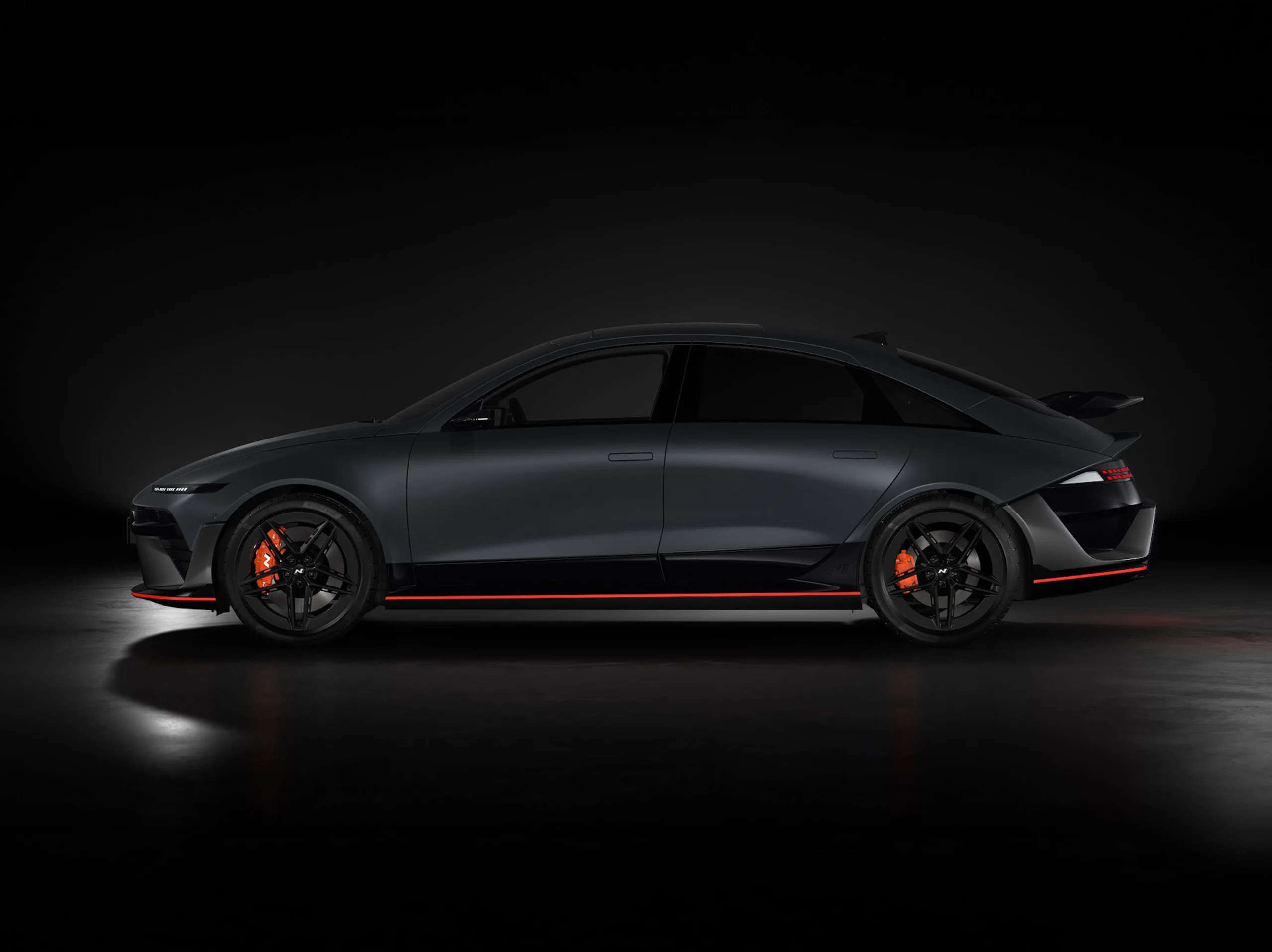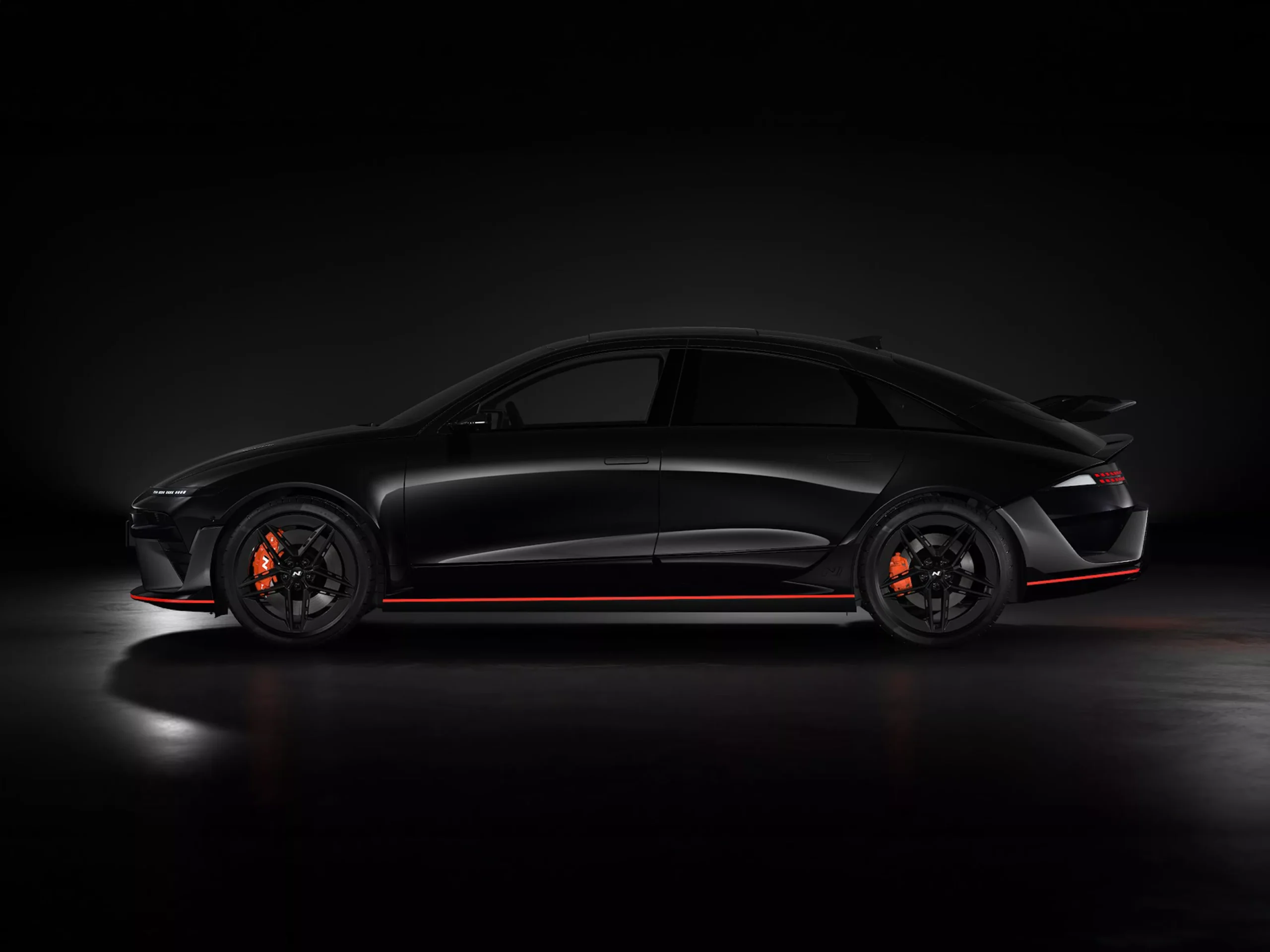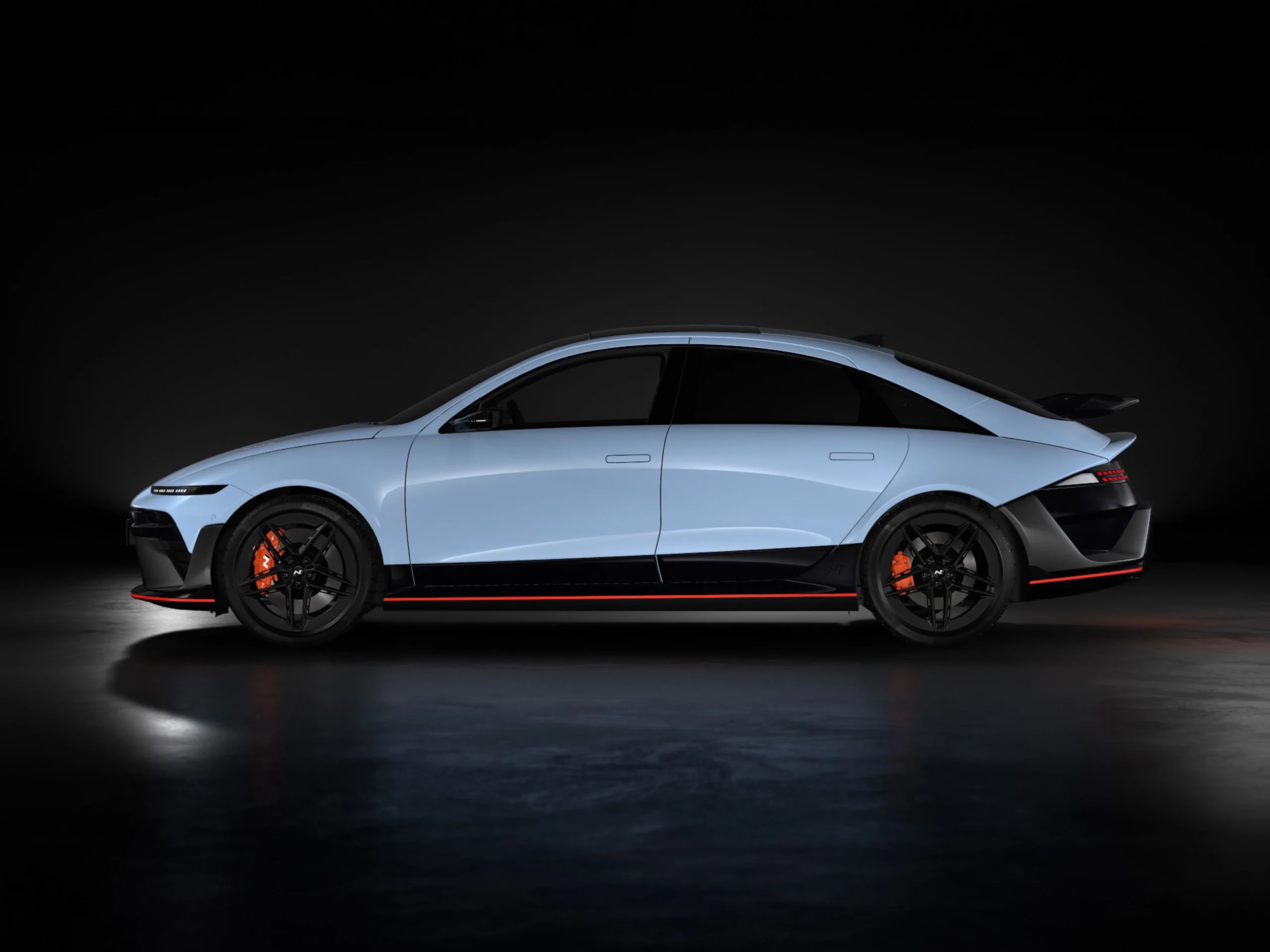 The sleek side silhouette and exclusive N large rear wing accentuate the bold, race-inspired EV profile. Glossy black side sills with a Luminous Orange accent line and orange strip connect the front and rear, highlighting the low stance of this high-performance streamliner.
