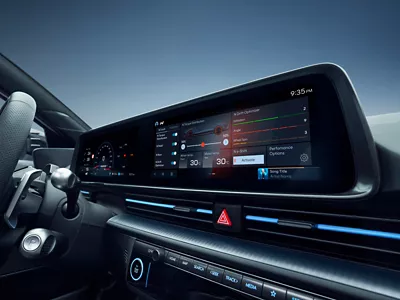 IONIQ 6 N’s sleek interior features exclusive Performance Blue contrast stitching throughout the cockpit as well as a luxurious black suede headliner. The seat belt webbing picks up on the Performance Blue theme as well.