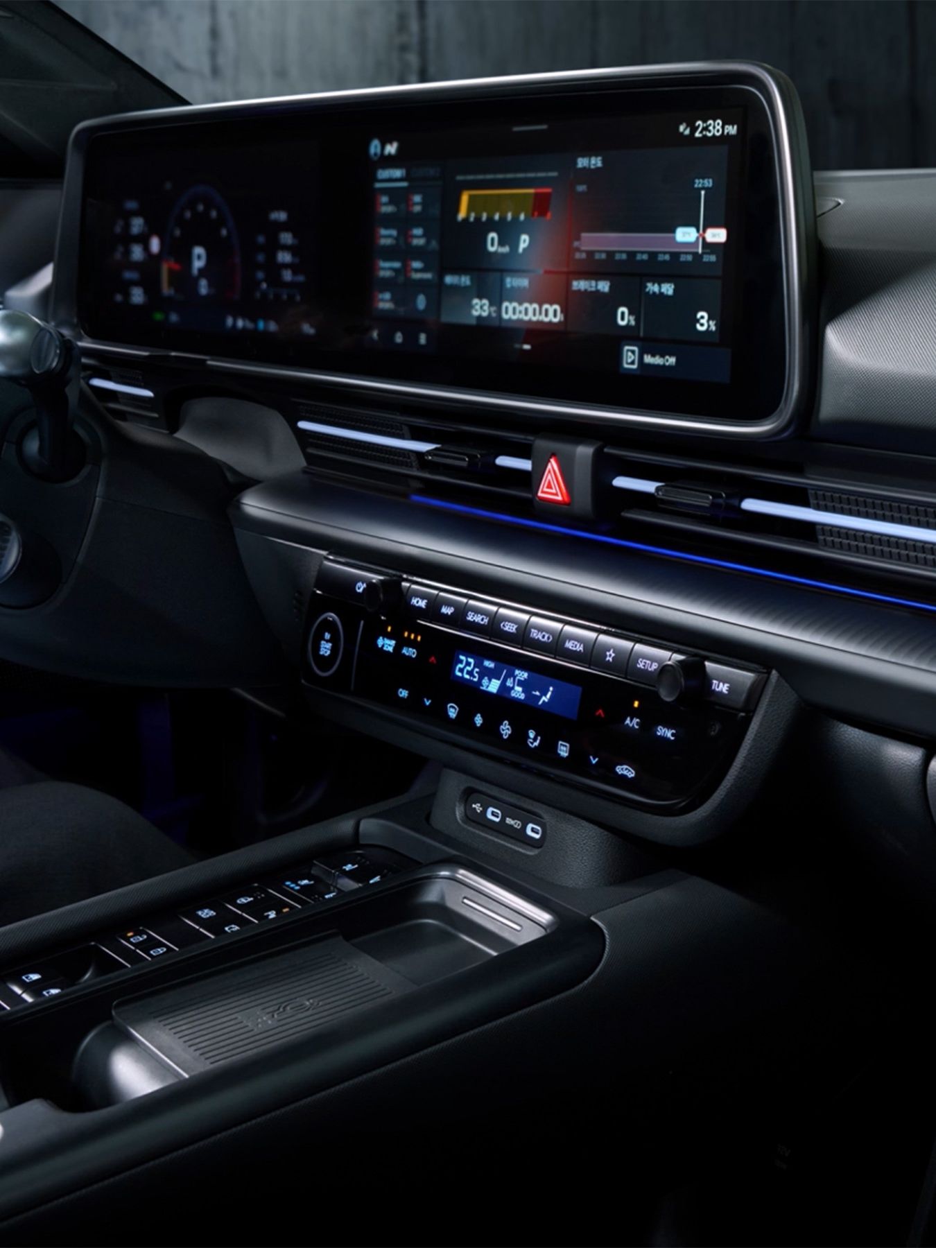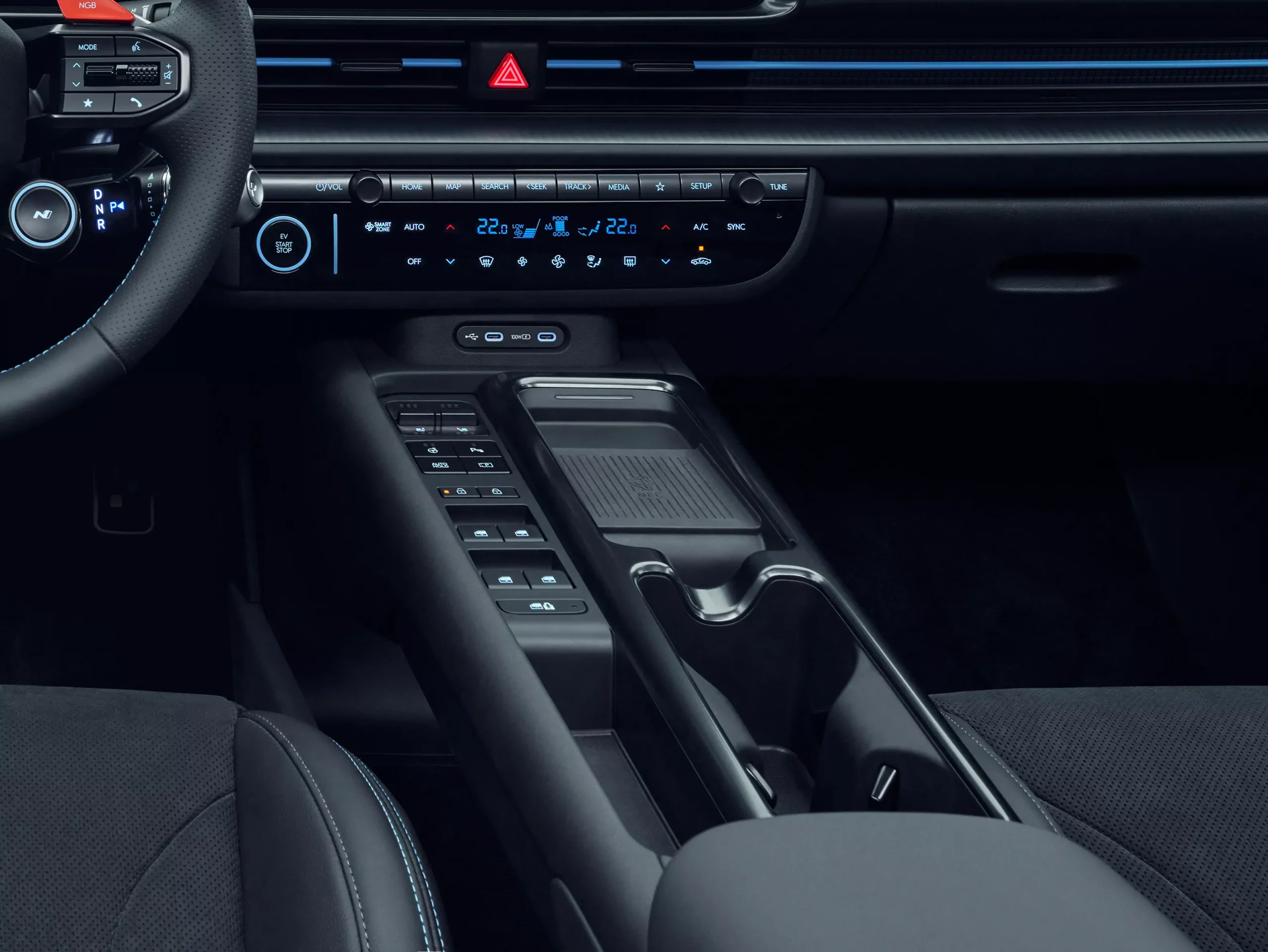 The centre console is optimised for track driving with a 3 mm knee pad and shin support added for cushioning. For everyday convenience, it also offers physical buttons for the seat heating & ventilation, an armrest, USB-C ports, a wireless charger and cupholders.