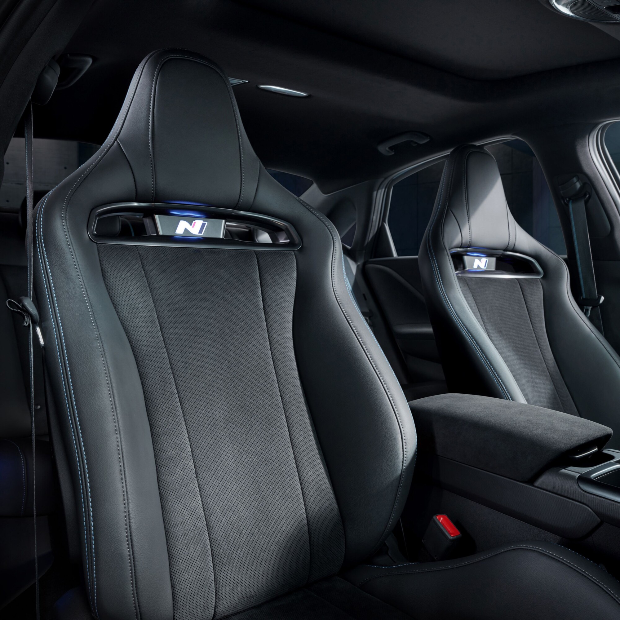 Welcome to the best seats in the house: the N Bucket Seats. Seen here in a luxurious recycled poly Alcantara and Leather finish, these sporty seats feature enhanced lateral support for stability during high-speed driving and cornering. Integrated heating and ventilation functions keep you comfortable and the illuminated N logos light up to welcome you when you open the door.