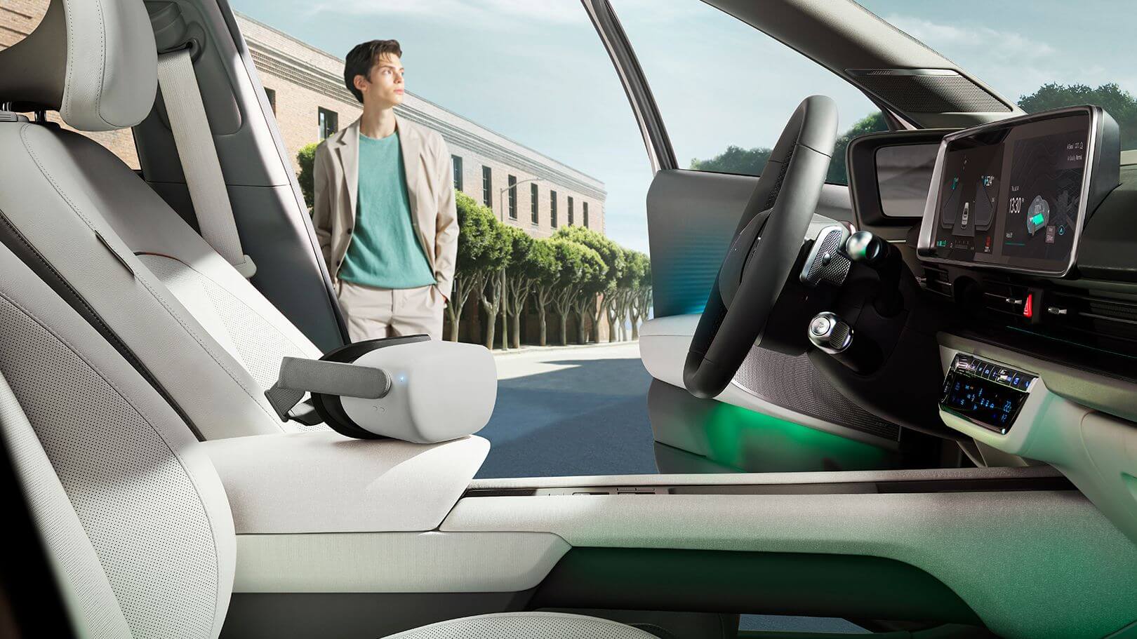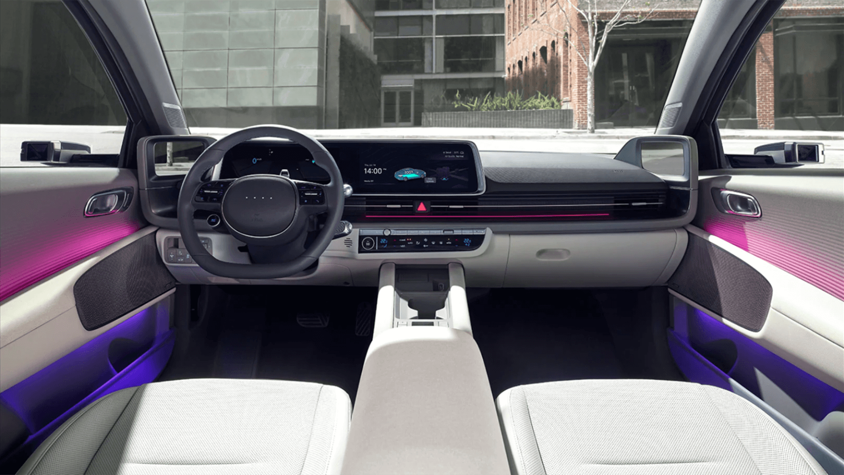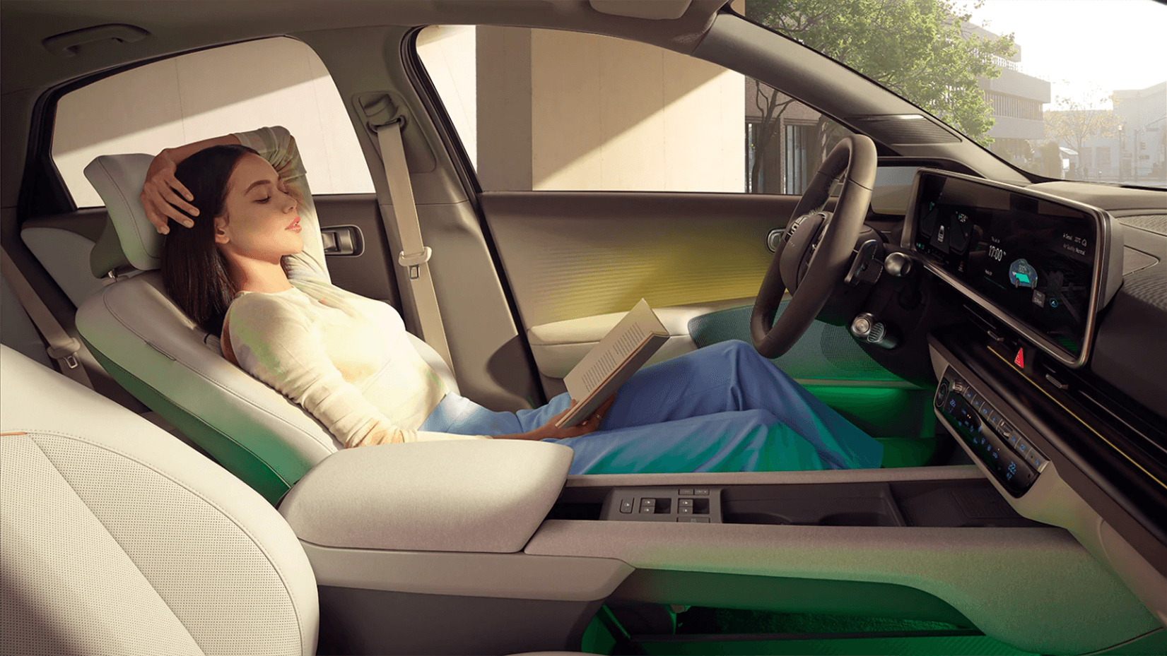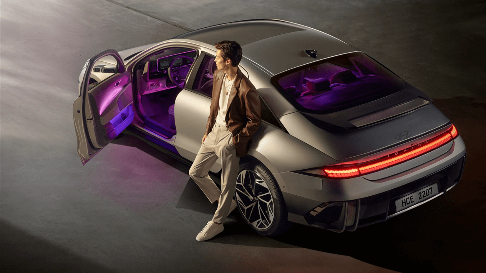 Discover a new level of personalised comfort. IONIQ 6’s cocoon-shaped interior provides you with a whole new in-car experience. Our new EV platform has enabled our designers to stretch the interior for optimised legroom and spaciousness. And the Dual Color Ambient Lighting harmonises with transparent materials for a relaxed and comfortable vibe that you can change to suit your mood.
