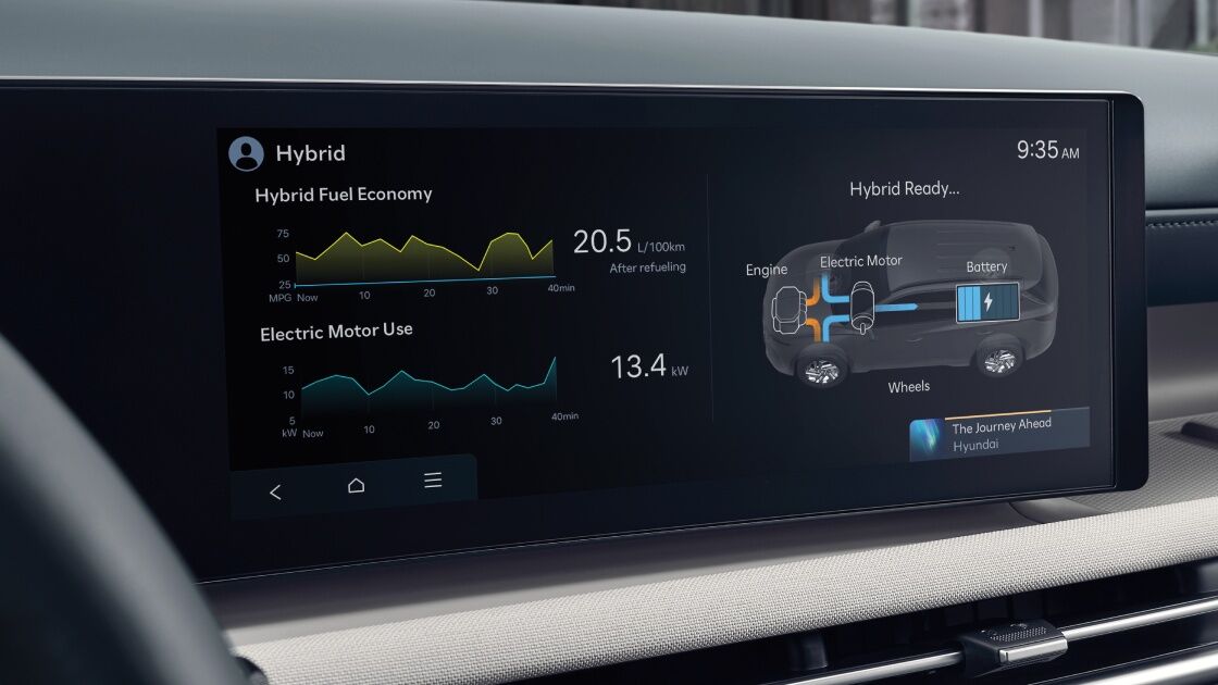 Hybrid exclusive contents. The Infotainment system displays information about hybrid driving, such as electric motor usage and fuel efficiency.